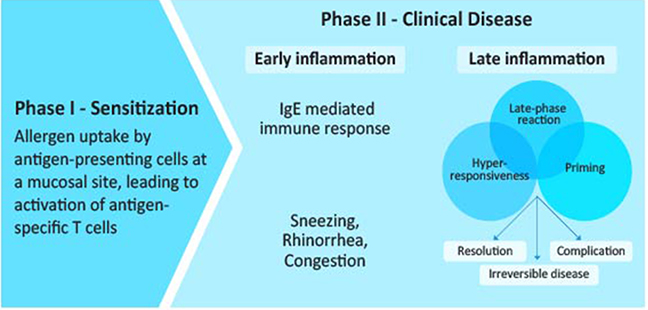Allergic rhinitis (AR) is an atopic disease characterized by an early IgE-mediated immune response to inhaled antigens and a subsequent leukotriene-mediated delayed response. Pathogenesis in allergic rhinitis has distinct clinical stages viz. allergen sensitization, re-exposure to allergens, followed by the development of early and late-phase reactions and nasal symptoms. The most classical presentation is with symptoms like sneezing, nasal congestion, clear rhinorrhea, and nasal pruritus.2