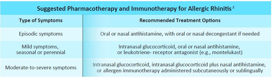 The diagnosis of allergic rhinitis is often made clinically based on the characteristic history, presentation and good response to empirical therapy. Allergen-specific IgE testing may be performed for morespecificity. Management options consist of allergen avoidance, agents that provide symptomatic relief,anti-inflammatory therapies and allergen-specific immunological therapies. Antihistamines, glucocorticoids and leukotriene receptor antagonists form the cornerstone of pharmacotherapy forallergic rhinitis. Recent advances in therapy include intranasal antihistamines and novel methods of delivery for intranasal steroids.