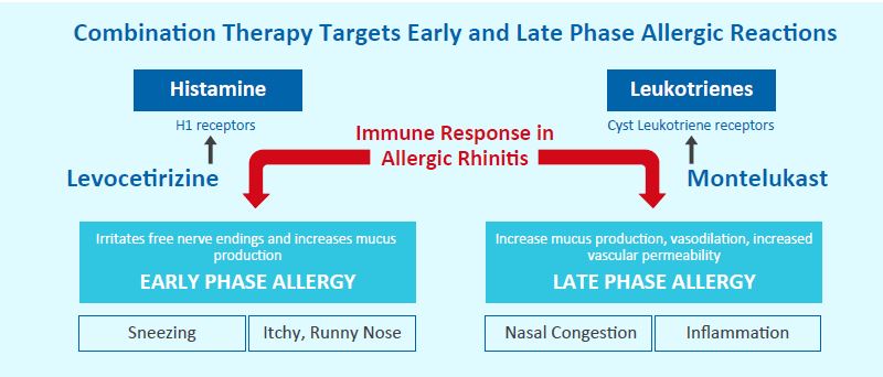 Montelukast is an orally active, highly selective cysteinyl leukotriene type-1 receptor antagonist, whereas Levocetirizine is a potent second-generation histamine receptor antagonist. Together, the combination can effectively combat both early and late-phase immune reactions that form the underlying pathophysiology of allergic rhinitis.4