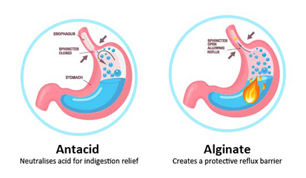 Alginate-based formulations act primarily by a unique nonsystemic mechanism of action, different from antacids, PPIs or histamine H2-receptor antagonists (H2 antagonists). Upon coming into contact with gastric acid, alginate rapidly forms a gel ‘raft’ of near-neutral pH that creates a protective barrier above the acidic gastric contents. This alginate raft protects the oesophageal mucosa by limiting gastric reflux into the oesophagus.7